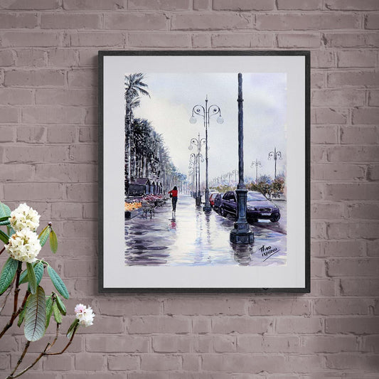 Watercolour painting, Palm Tree Promenade After The Rain