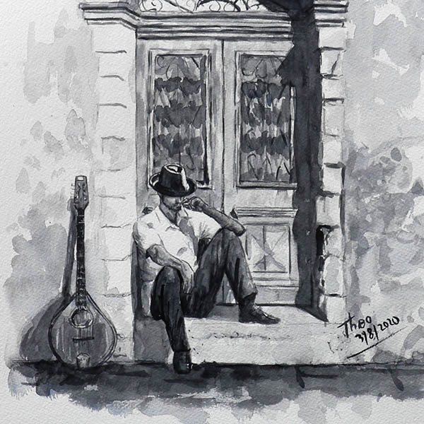 Watercolour sketch, The Bouzouki Player